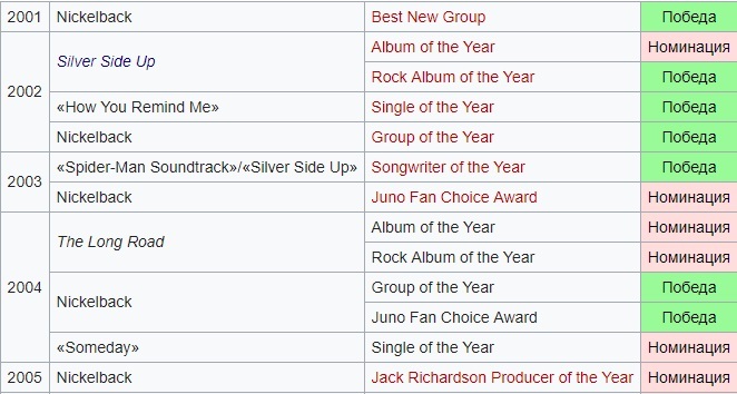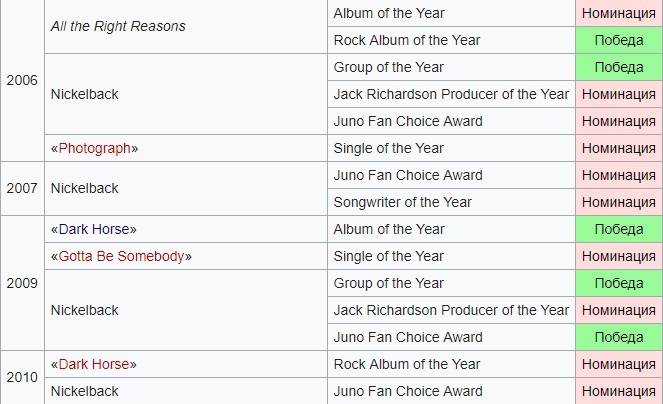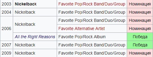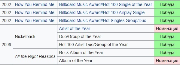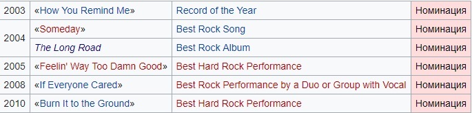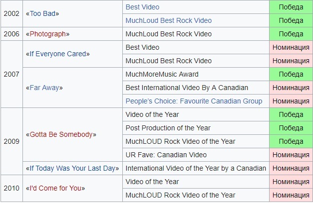 Список наград канадской рок-группы Nickelback включает в себя премии и номинации, полученные ими с момента начала музыкальной карьеры в 1996 году. Их сингл Silver Side Up был № 1 в чартах Billboard Hot 100, Hot Mainstream Rock Tracks, Hot Modern Rock Tracks и в Canadian Hot 100. Пятый студийный альбом группы All the Right Reasons был продан тиражом в 11 млн.копий во всём мире в 2008 году. В 2007 году группа Nickelback была введена в Canada's Walk of Fame. Всего группа Nickelback имеет 32 награды и 71 номинацию.